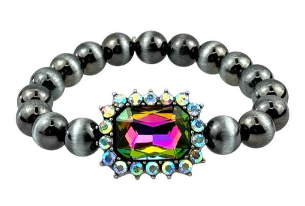 This Navajo bracelet is elastic with Navajo pearls with mystic rhinestone. This bracelet has 12mm burnished, Navajo style, silver tone beads with a large octagon shape rhinestone charm. The rectangle rhinestone is rimmed in round rhinestones. One size fits most and it stretches for easy on and off.