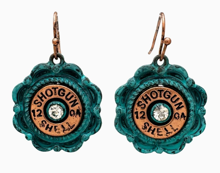 Floral Design 12 Gauge Shotgun Shell. Patina color, 1 inch Hook Dangle Earrings with rope.